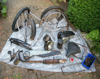 1996 bin ich dann endlich dazu gekommen mit der Komplettrestauration zu beginnen, was sich allerdings aus beruflichen Gründen bis zum Jahre 2000 hinzog. Zum Glück waren fast alle Teile noch vorhanden, es fehlten lediglich das Schutzblech für den motorseitigem Antrieb und die Rückleuchte die war nicht mehr zu retten, aber es gibt noch Ersatz zu kaufen. Das Schutzblech hab ich später selbst nachgefertigt. Den Sitz hab ich bei einem bekannten Sattler beziehen lassen, das Untergestell des Sattels hab ich selber überholt. Dann musste als erstes eine Liste erstellt werden um alle Verschleissteile dort aufzuführen, dann konnte mit der Suche nach Teilen begonnen werden.